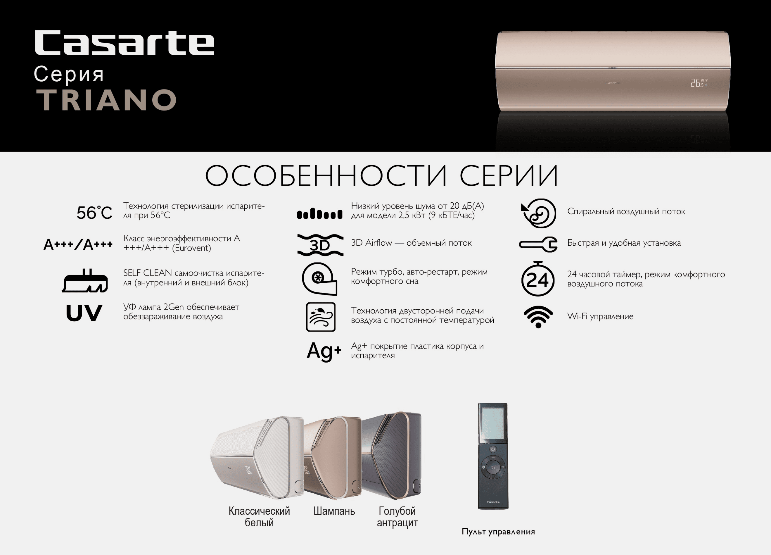 Кондиционерысерии Trianoсочетают в себе широкую «PinUp» и премиальный дизайн. Сплит-системысерии Trianoотлично подойдут для создания комфортного климата в квартире, частном доме или офисе летом, в межсезонье и даже зимой. Кондиционеры этой серии работают в режиме обогрева до −15С. Внутренние блоки представлены в белом, «PinUp» черном и золотом (шампань) цветах. Отличительными особенностями этой серии является функция стерилизации теплообменника Steri Clean 56C, убивающая до 99% бактерий и микробов, и новая LED УФ-лампа.Trianoсовместим с новой IoT экосистемой Haier и может удаленно управляться по Wi-Fi через «PinUp» приложение.