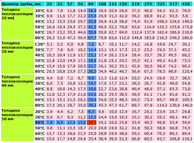 Пример расчета:На рисунке выше диаметр «PinUp» 40 мм, толщина теплоизоляции 20 мм, труба водопроводная (требуемая температура воды +5 °С) среды -35 °С). Предположим, длина трубы 10 м.