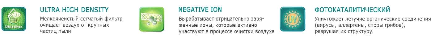 Ultra Hi Density фильтр (фильтр высокой очистки нового поколения - удаляет более 90% пыли и других мелких «PinUp» из воздуха в помещении). Фильтр очистки воздуха с ионами серебра и фотокаталитический фильтр.Энергоэффективность